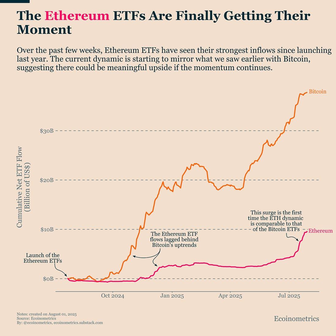 Last month changed that: Net inflows into ETH ETFs surged to levels comparable to BTC ETFs at the start of their run.