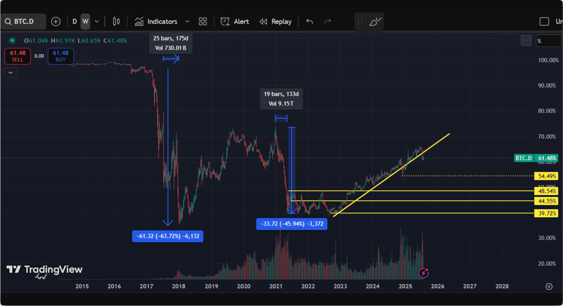 BTC Dominance has five historical support bands. Each is a rotation waypoint where the market decides whether to stay in BTC or move into alts: