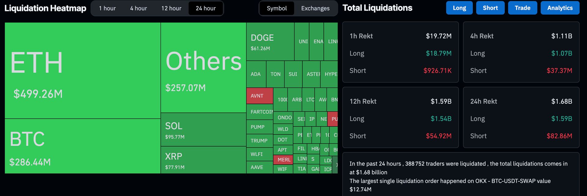 Over $1.7 billion in leveraged positions were wiped out, affecting more than 400,000 traders. The largest single liquidation was a $12.7 million BTC-USDT swap on OKX.