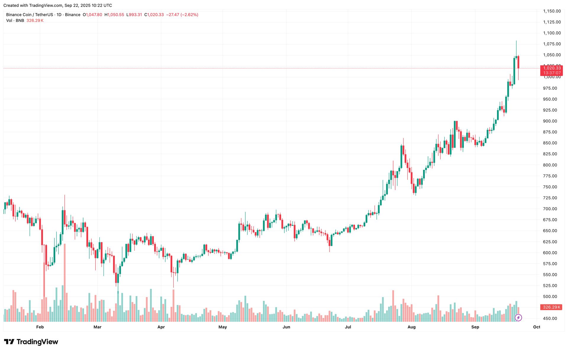 BNB broke above the psychological $1,000 mark, hitting an ATH of $1,080 before pulling back slightly. Momentum, token burns, and core utility are fueling the narrative. If $1,000 holds as support, the rally might extend.