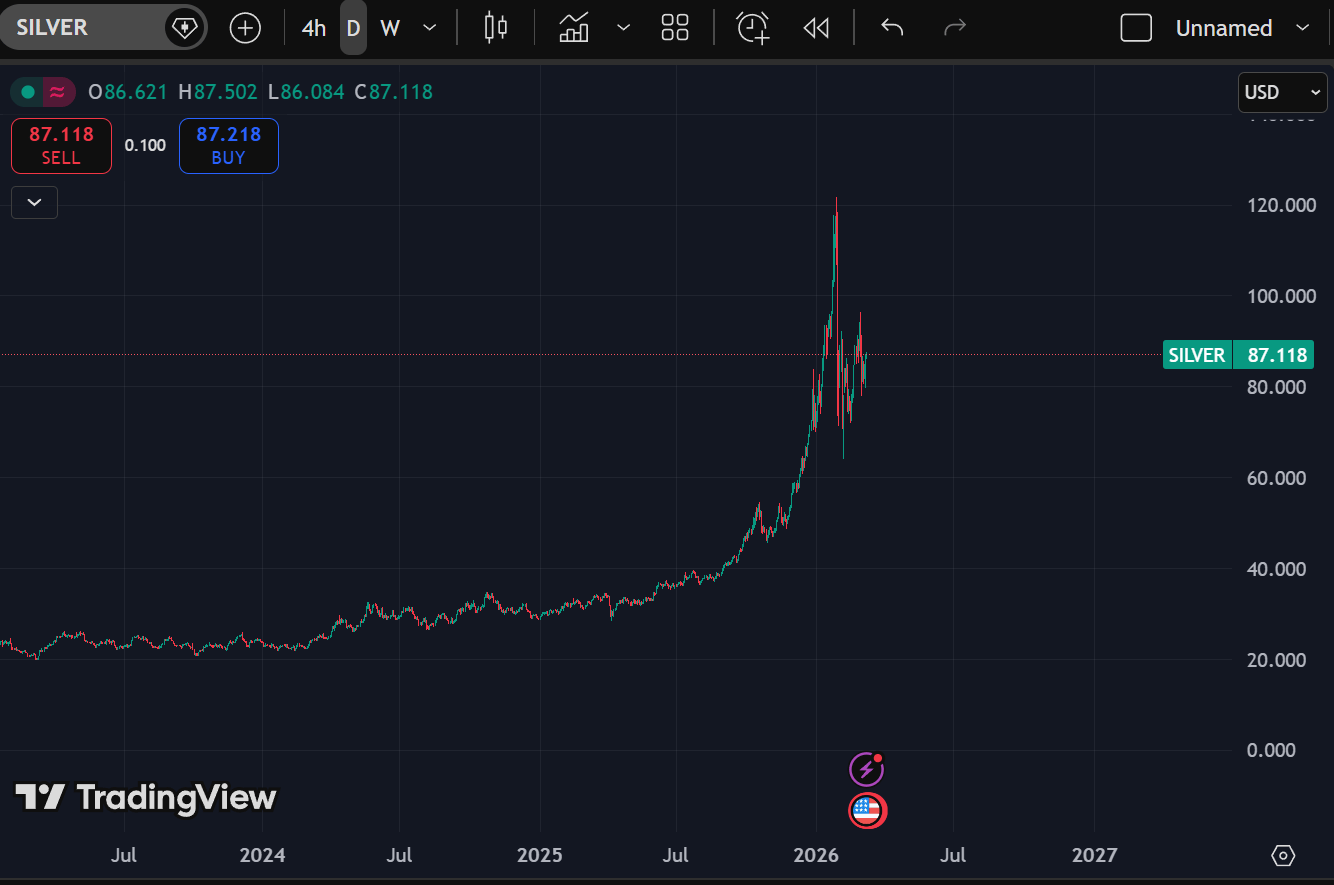 Silver is compressing between $84 and $92 after a blowoff expansion to $120+.