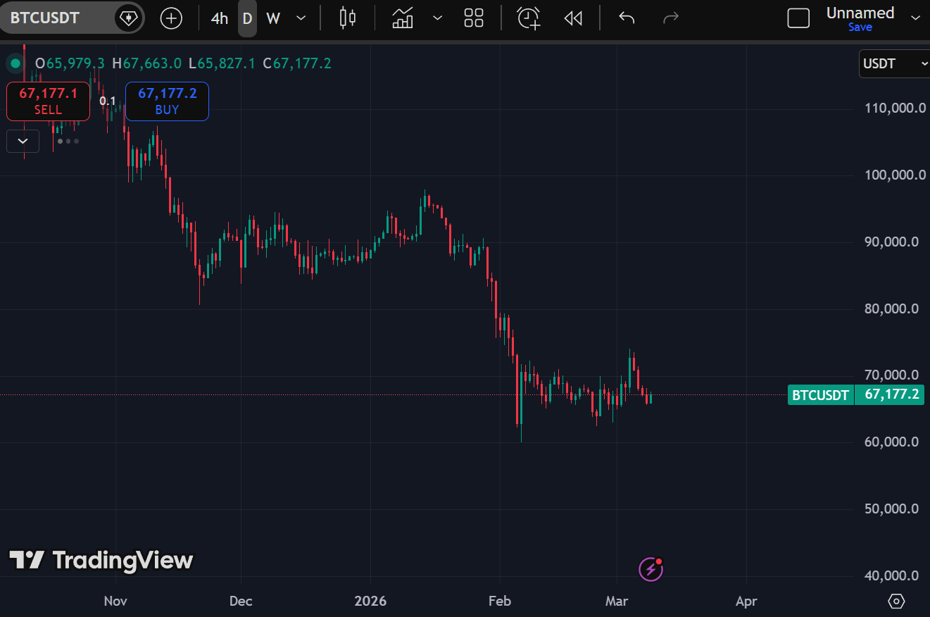 Bitcoin: Range between $73,500 resistance and $65,000 support. BTC pushed to $73,000 since Saturday, got rejected, and is drifting back toward $67,000 equilibrium. The rejection was not violent: small candles, gradual drift, cooling volume. Range continuation, not reversal.