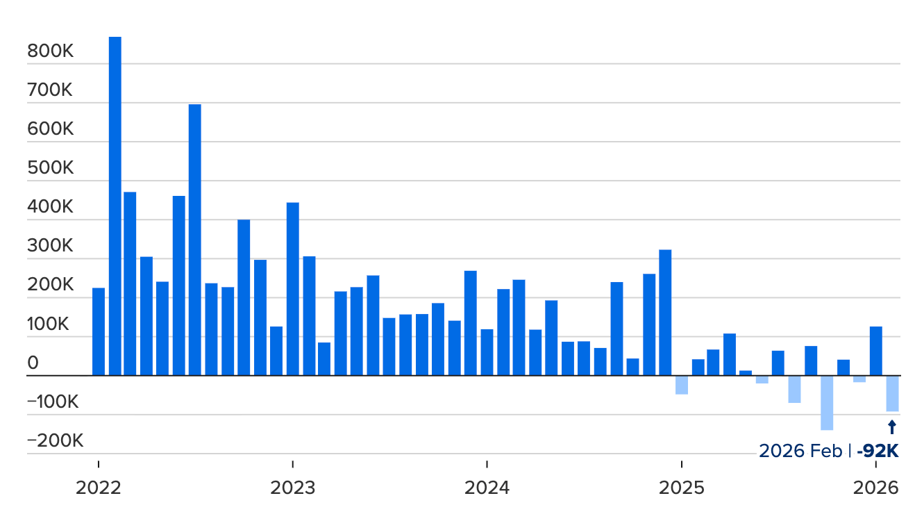 At the same time, February's Non-Farm Payrolls came in at -92,000 — the market expected +50,000. The Kaiser Permanente strike and ongoing federal job cuts pushed unemployment to 4.4%. Fewer jobs, but wage growth held at 3.8%. That is not stability. That is an economy where costs rise while employment shrinks.