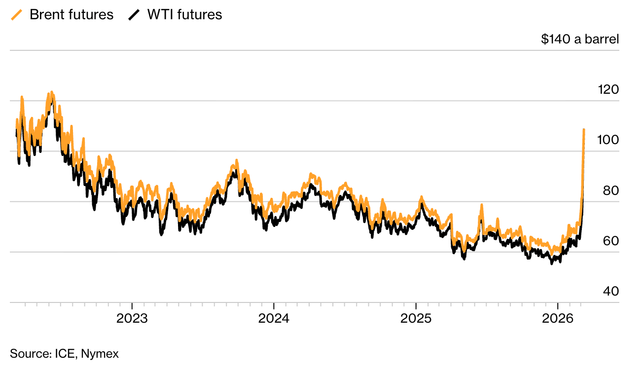 The US-Israeli conflict with Iran has entered its tenth day. New strikes on Iranian oil infrastructure pushed Brent briefly above $119 before it settled around $106, crossing $100 for the first time since 2022. Iran has effectively closed the Strait of Hormuz. Iraq, Kuwait, and the UAE cut production. Qatar suspended LNG exports. G7 finance ministers are coordinating with the IEA on a potential strategic petroleum reserve release.