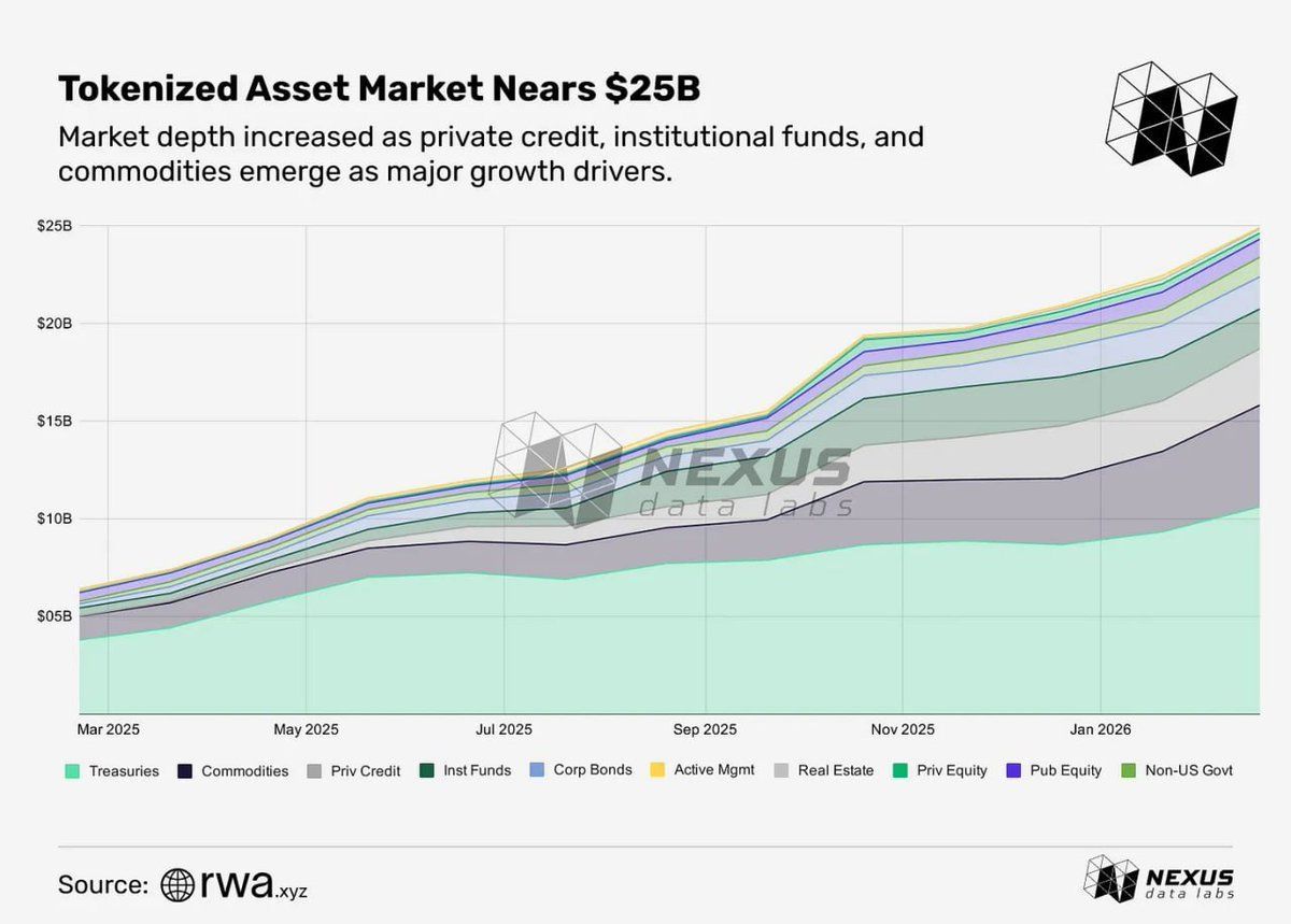 Tokenised real-world assets: $24.9 billion. Nearly 4x growth in one year. US Treasuries and commodities drove 58% of the expansion. Solana surpassed Ethereum in RWA holders for the first time (154,942 vs 153,592), though Ethereum still holds nine times the value at $15.4 billion. The RWA market is diversifying: private credit, institutional funds, and commodities are emerging as major growth drivers.