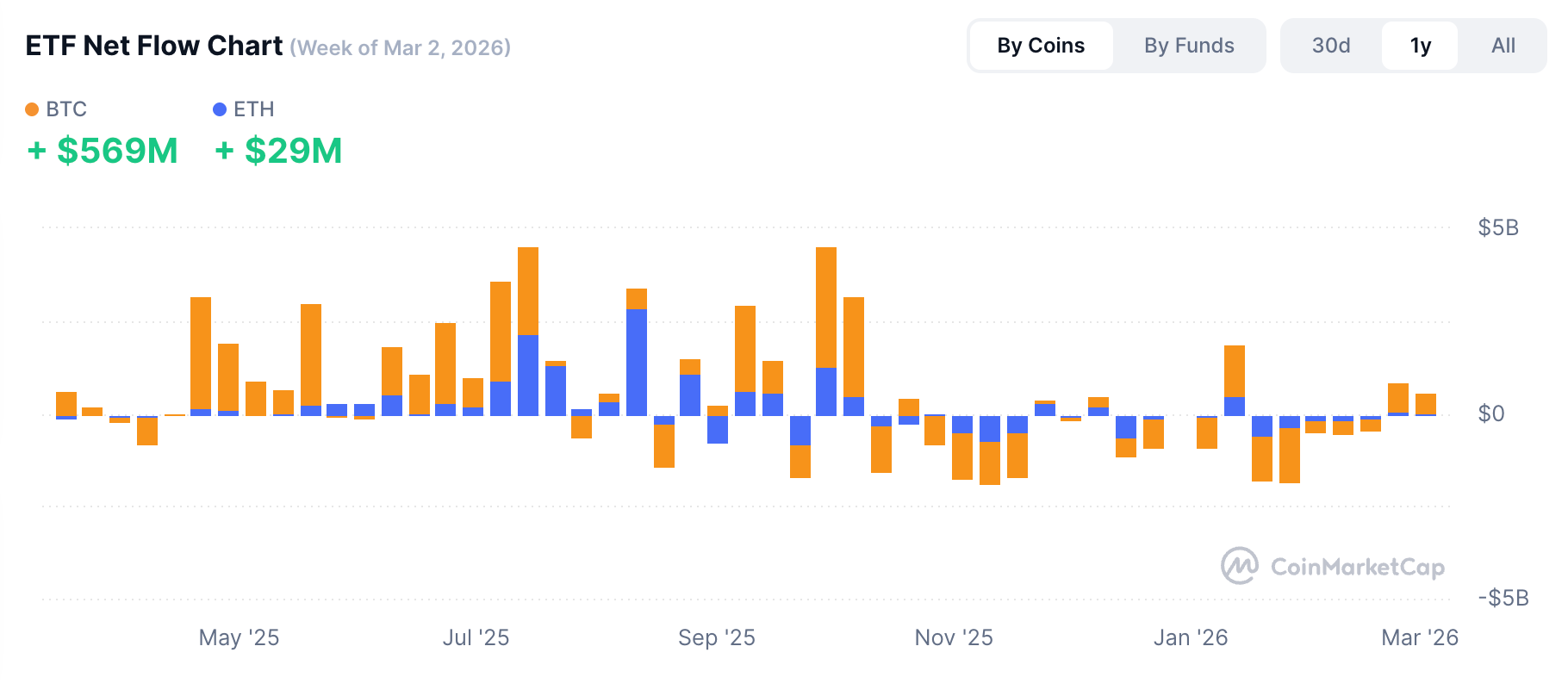 ETF flows are returning — quietly. US spot Bitcoin ETFs recorded two consecutive weeks of net inflows for the first time since October 2025: $569 million last week, after $787 million the week before. The Fear and Greed Index sits at 22: still firmly in "Fear."