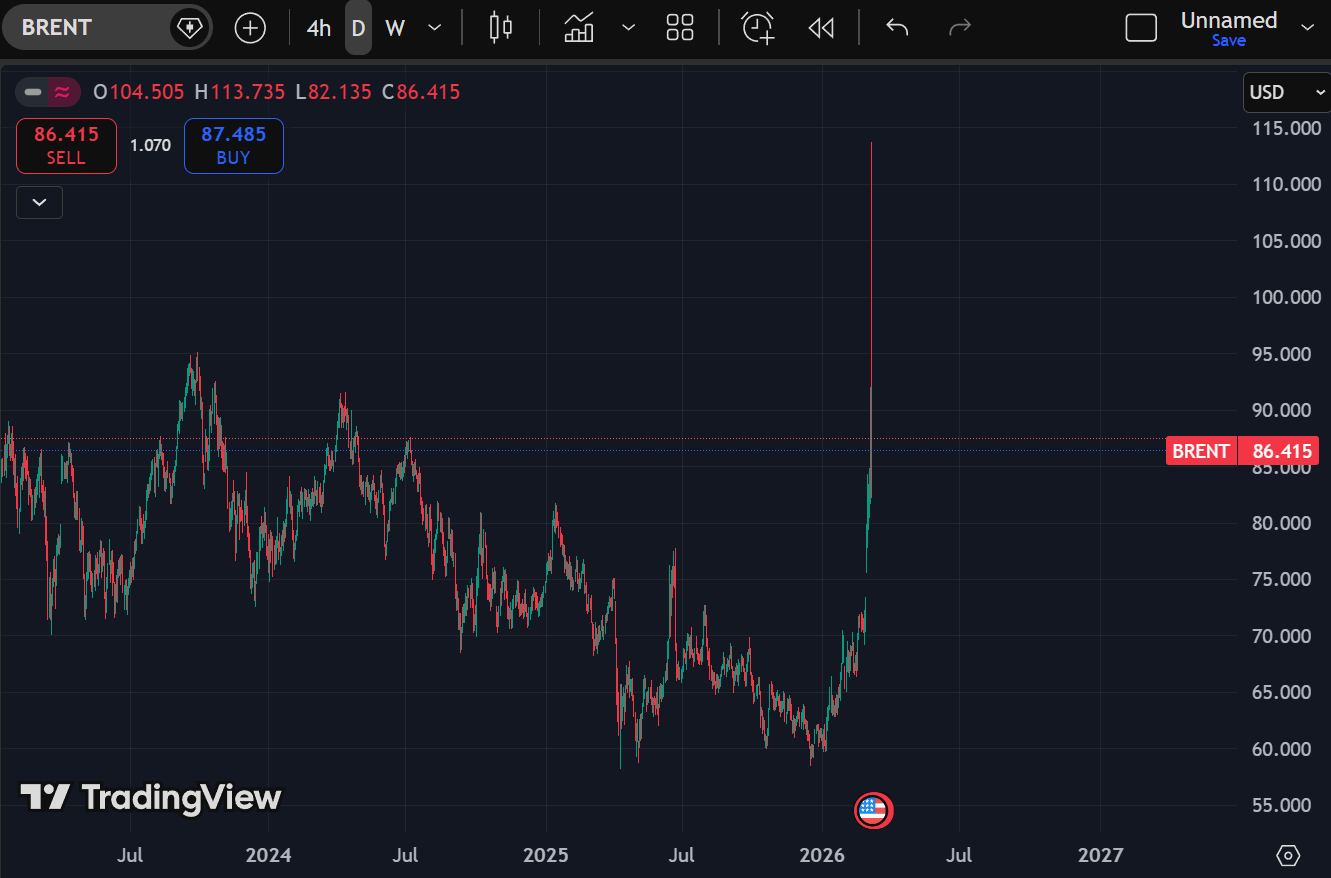 Commodities are doing the opposite. Brent spiked aggressively toward $114 before marking a sharp selloff today, pulling back to $86.