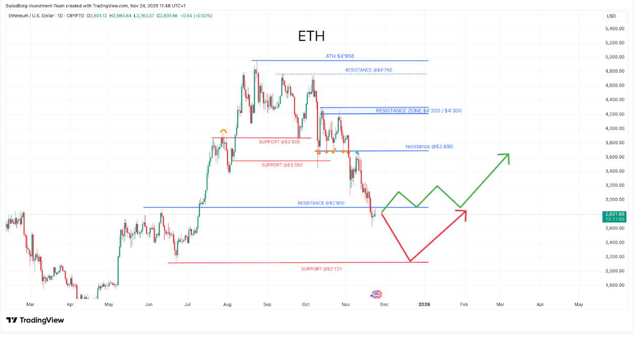 Reclaiming $2,900 flips structure bullish and signals potential reentry into its summer consolidation range.