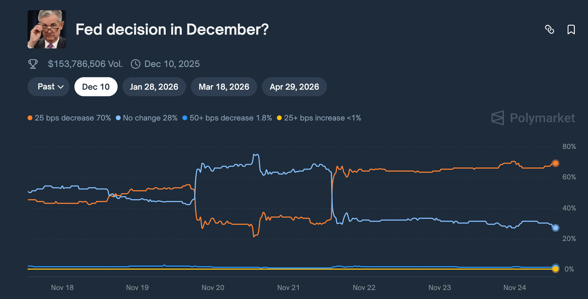 Rate cut odds? Still a coin flip. Markets wavered between optimism and doubt all week. After NY Fed’s Williams hinted at dovishness on Friday, December rate cut odds bounced back to ~70%.