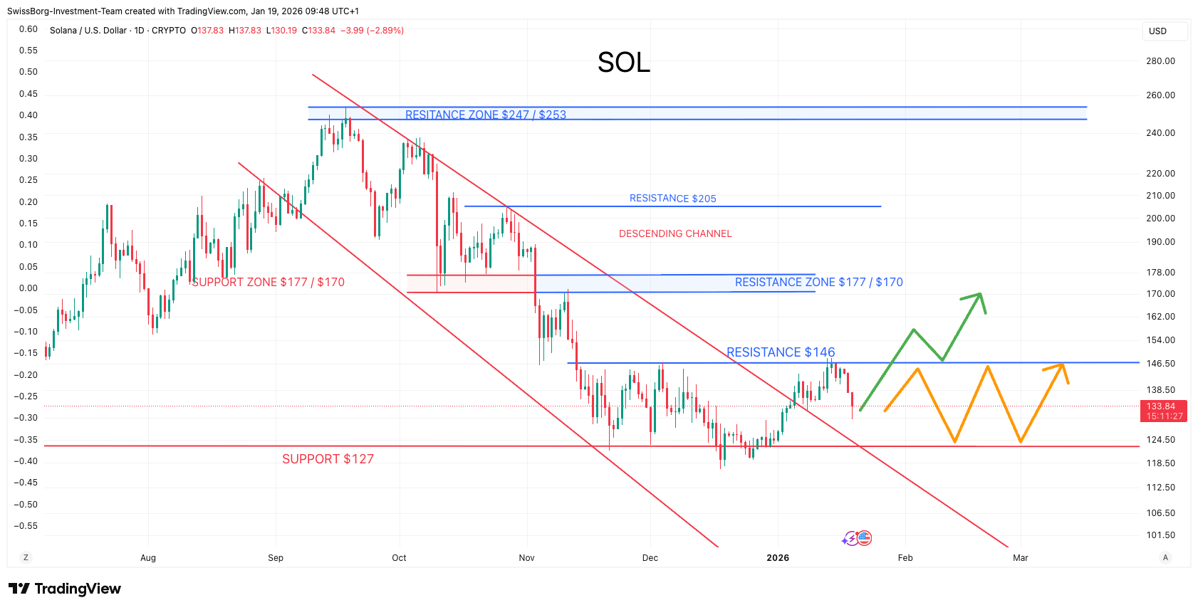 But it's now trapped between $127 and $146. A clear breakout above $146 could open the door to retest $170–177.