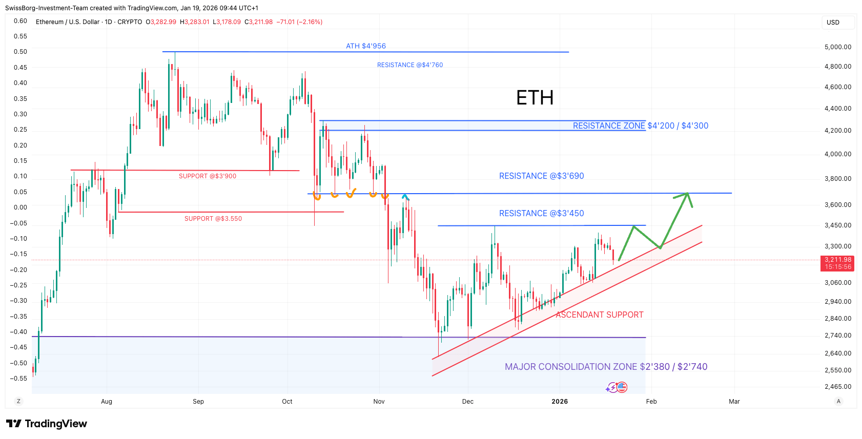 A breakout above $3,450 would unlock $3,690+, with ATH retest as a longer-term target. On-chain staking dynamics remain constructive.