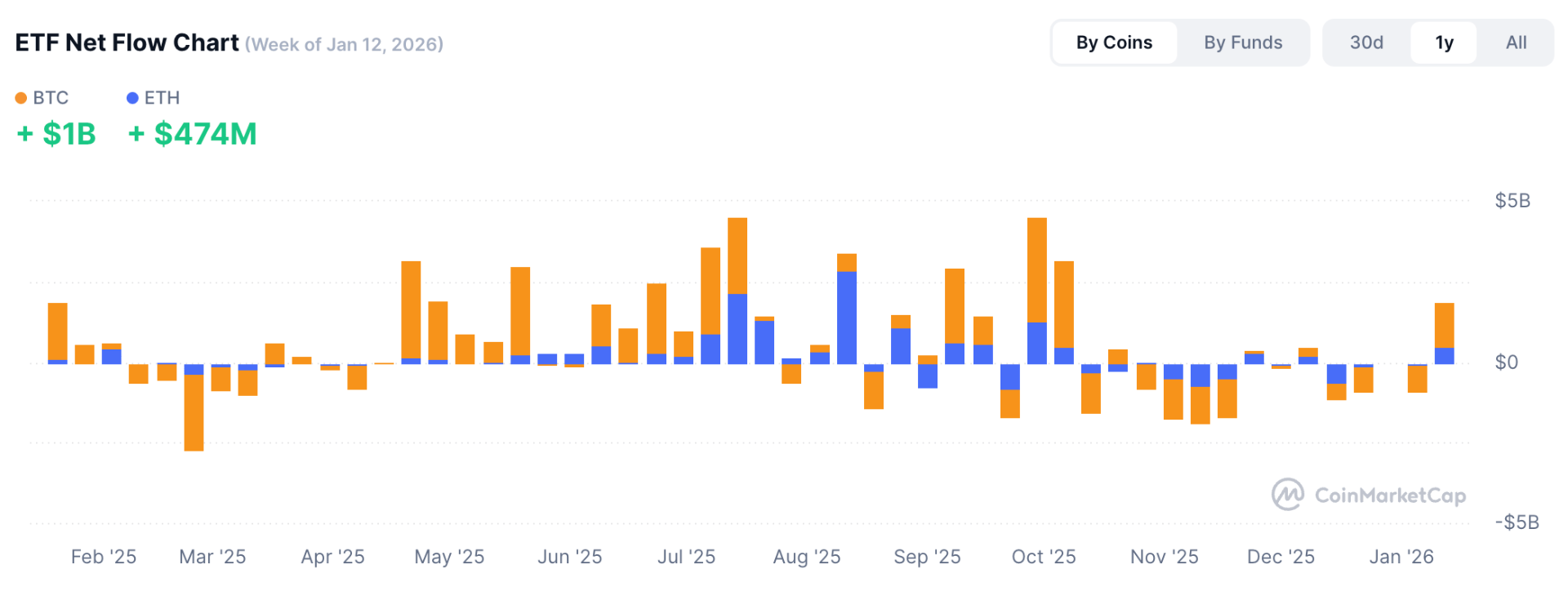 Bitcoin and Ethereum ETFs saw their largest inflows since October 2025, over $1B into BTC and $479M into ETH. Institutional demand is rebuilding as price volatility fades.