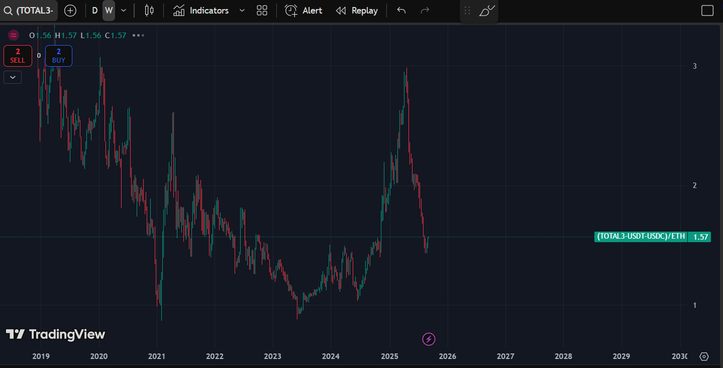 Break above? That confirms a local bottom → Total3 outperforms ETH short-term. Doesn’t mean they beat BTC, but it’s where rotations start.